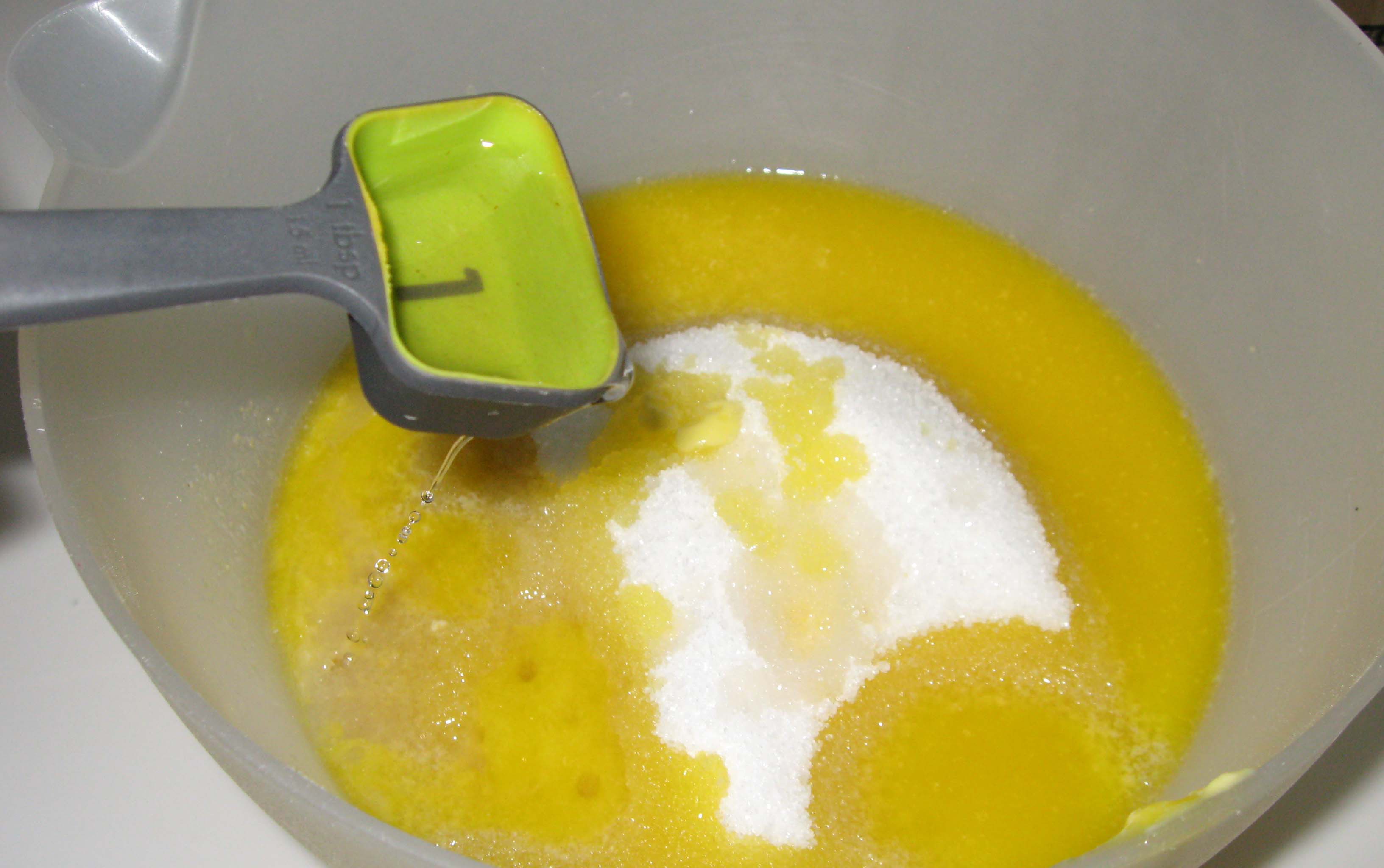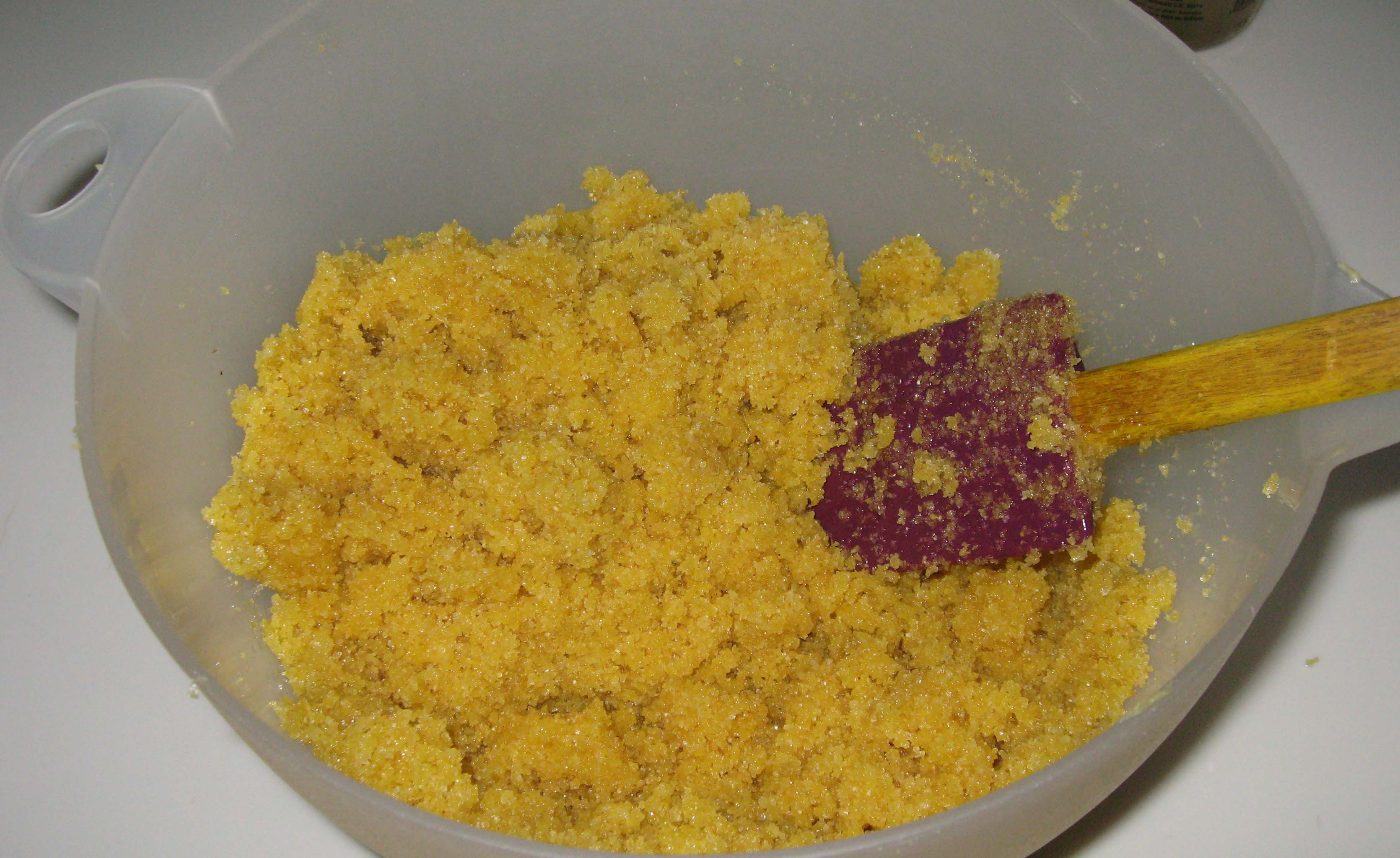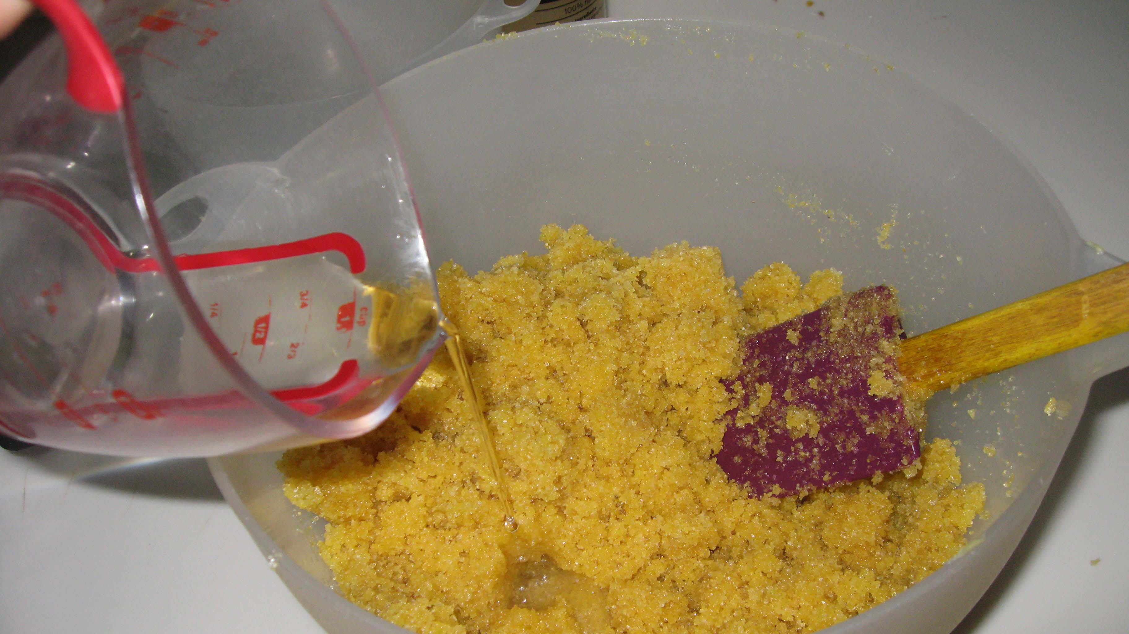 Adding orange blosson water to the semolina, sugar and melted butter