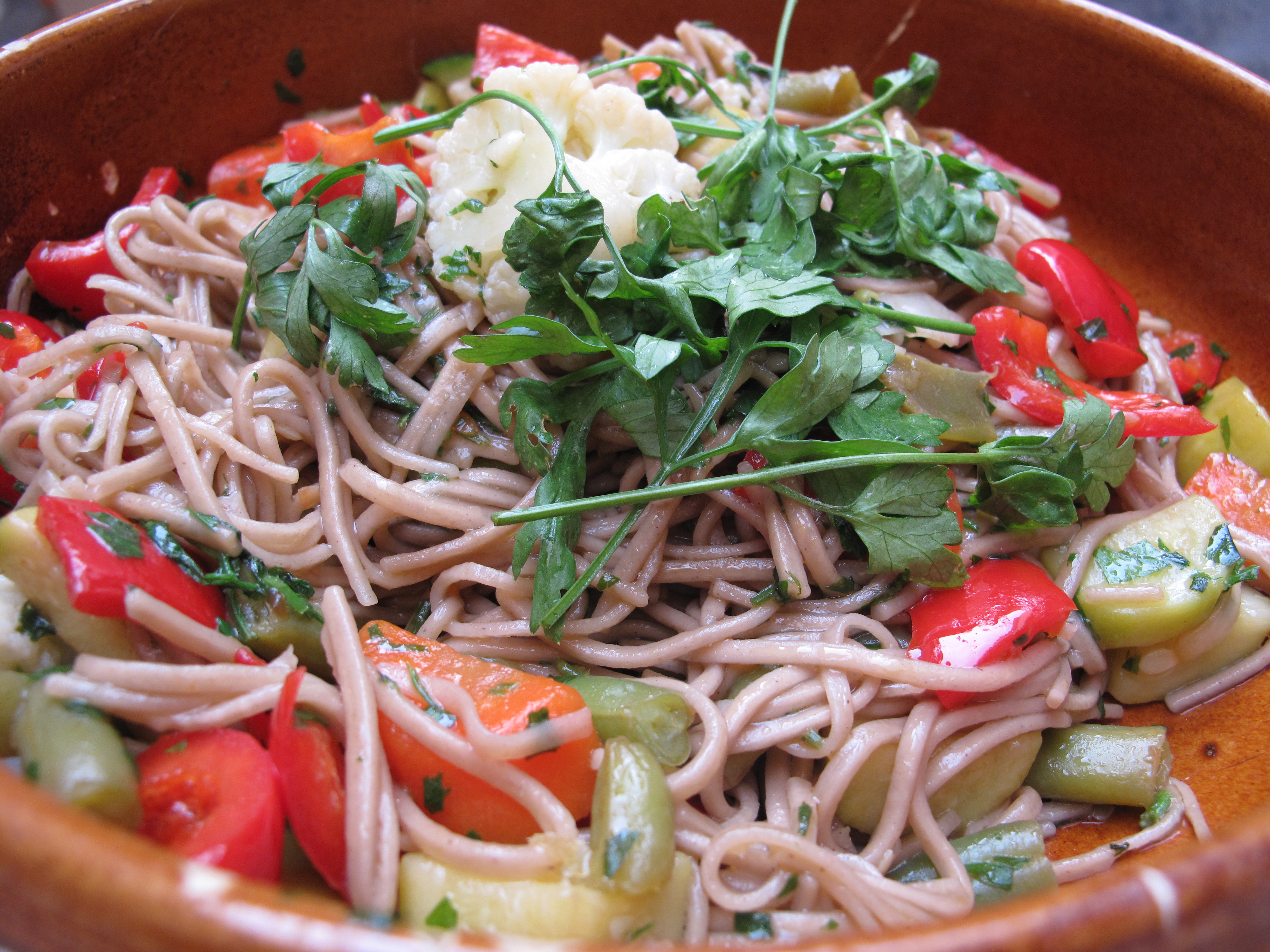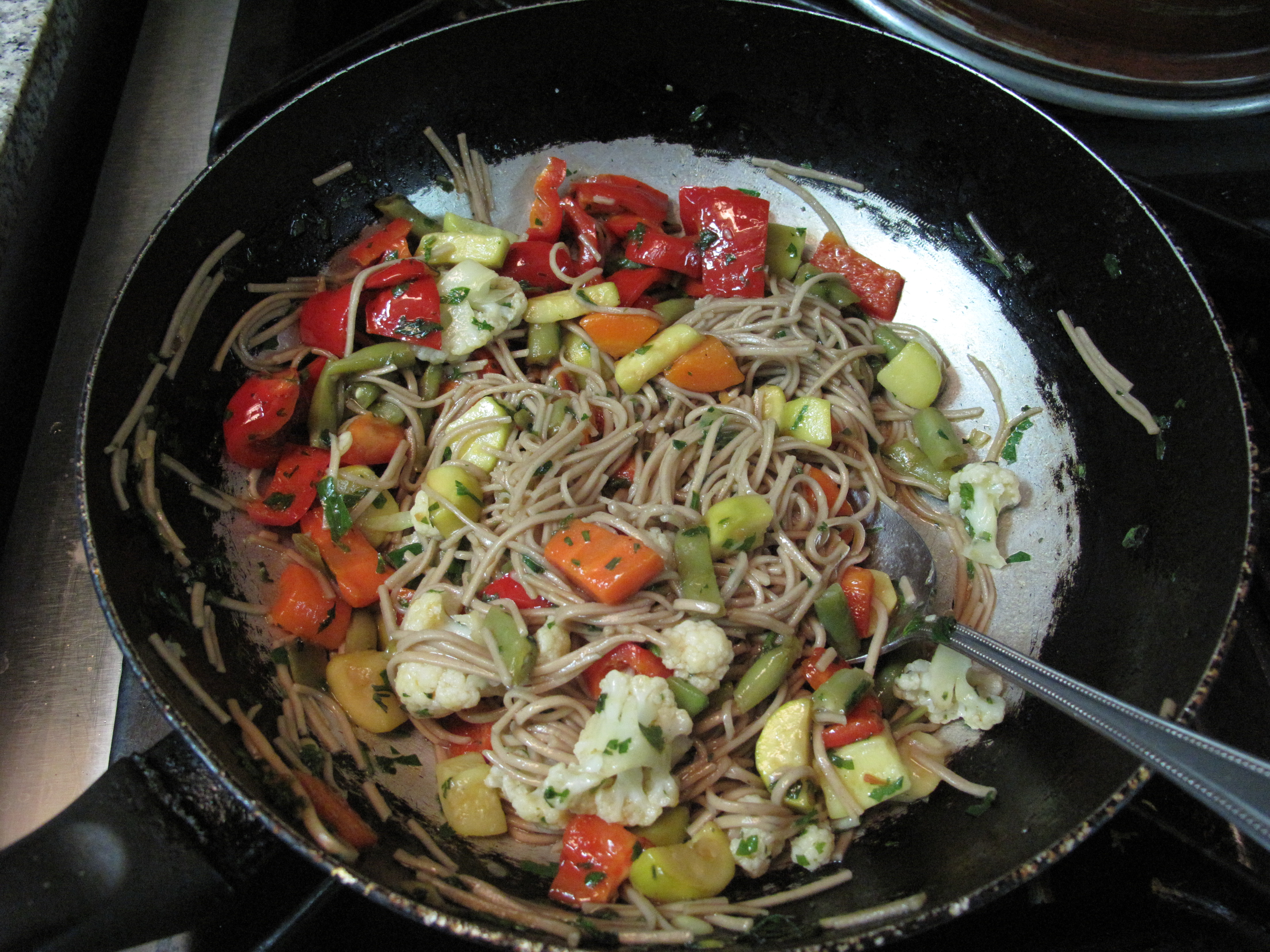 IMG_1358Add the noodles  and mix with vegetables. Add a splash or two of sesame oil. Salt and pepper to taste.