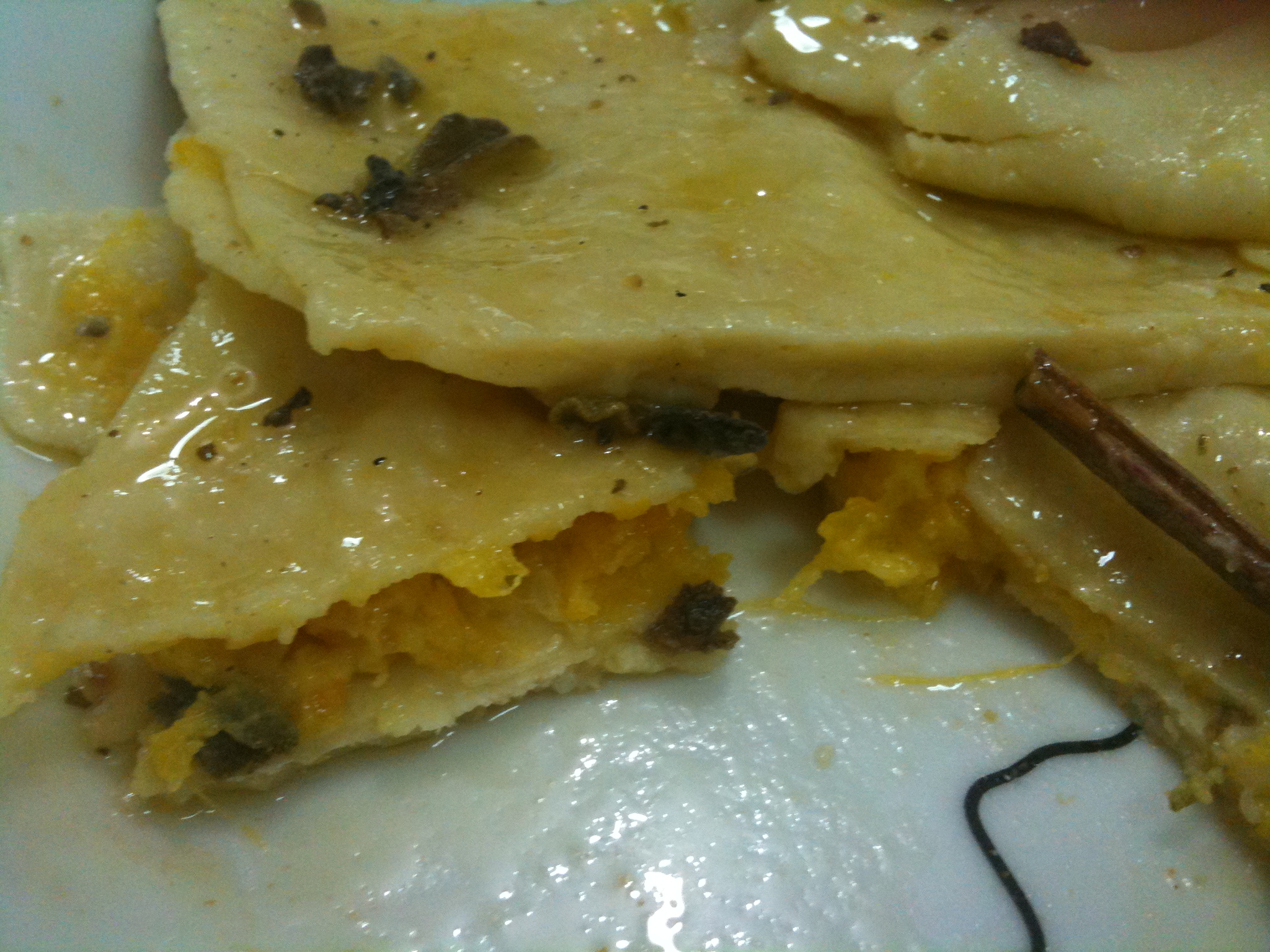 My sister as a way of shortcut once made pasta with cubed pumpkin cooked in butter and and sage until very soft and ever since I tried that I had fallen in love with this idea. So I wanted to translate this idea into ravioli…
