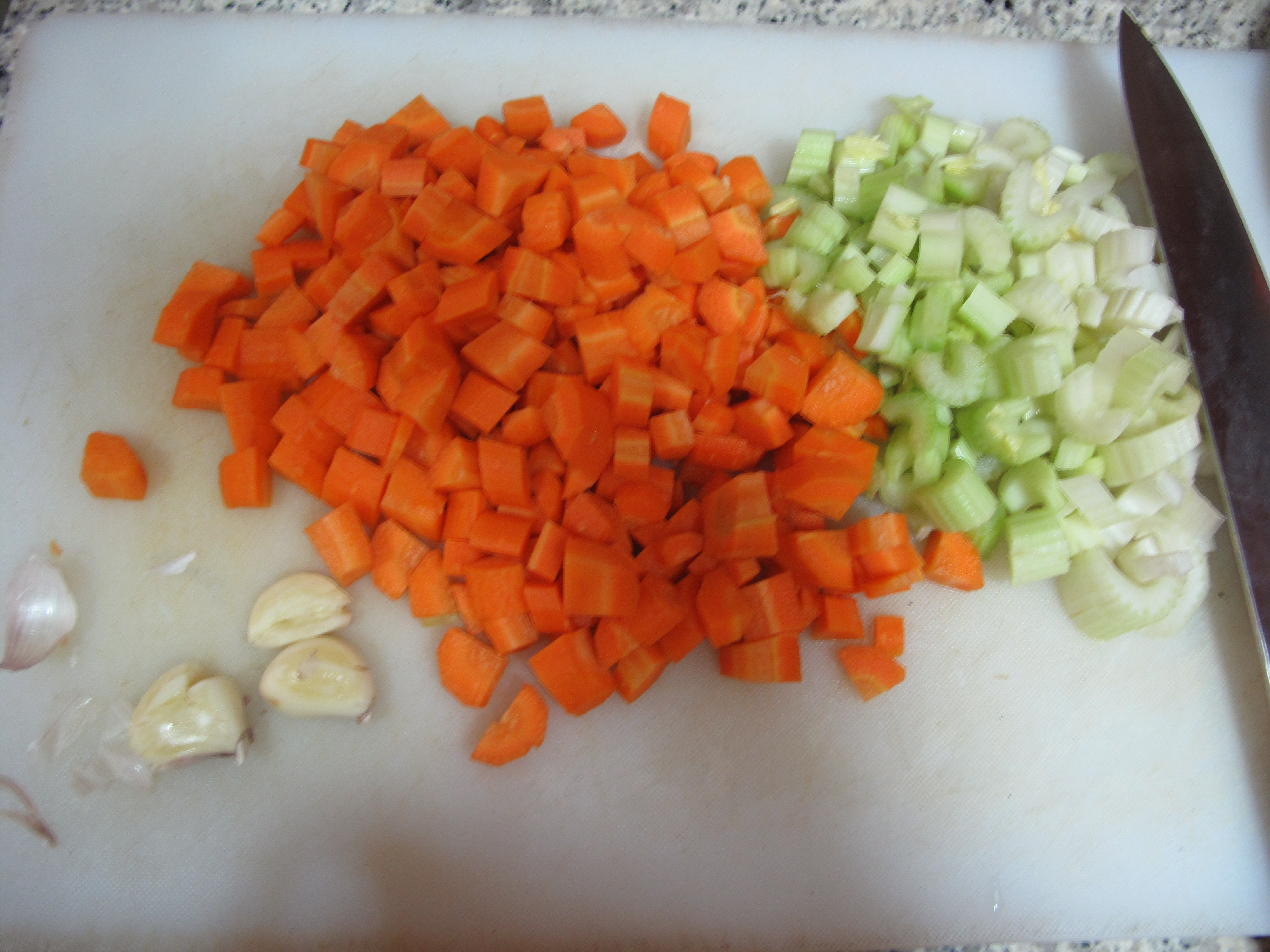 In a large heavy-bottomed pot heat a splash of good quality extra virgin olive oil. I used my lovely Tuscan olive oil. Add the garlic for 1 minute and then add the celery and carrots. Cook for 15 minutes.
