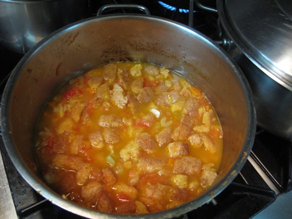 Now it’s time  to add the bread. Please note that you most likely won’t use the entire loaf. Add a handful at a time and mix and then until you feel the sauce can’t soak up anymore bread. Then add 1 liter of water and mix.