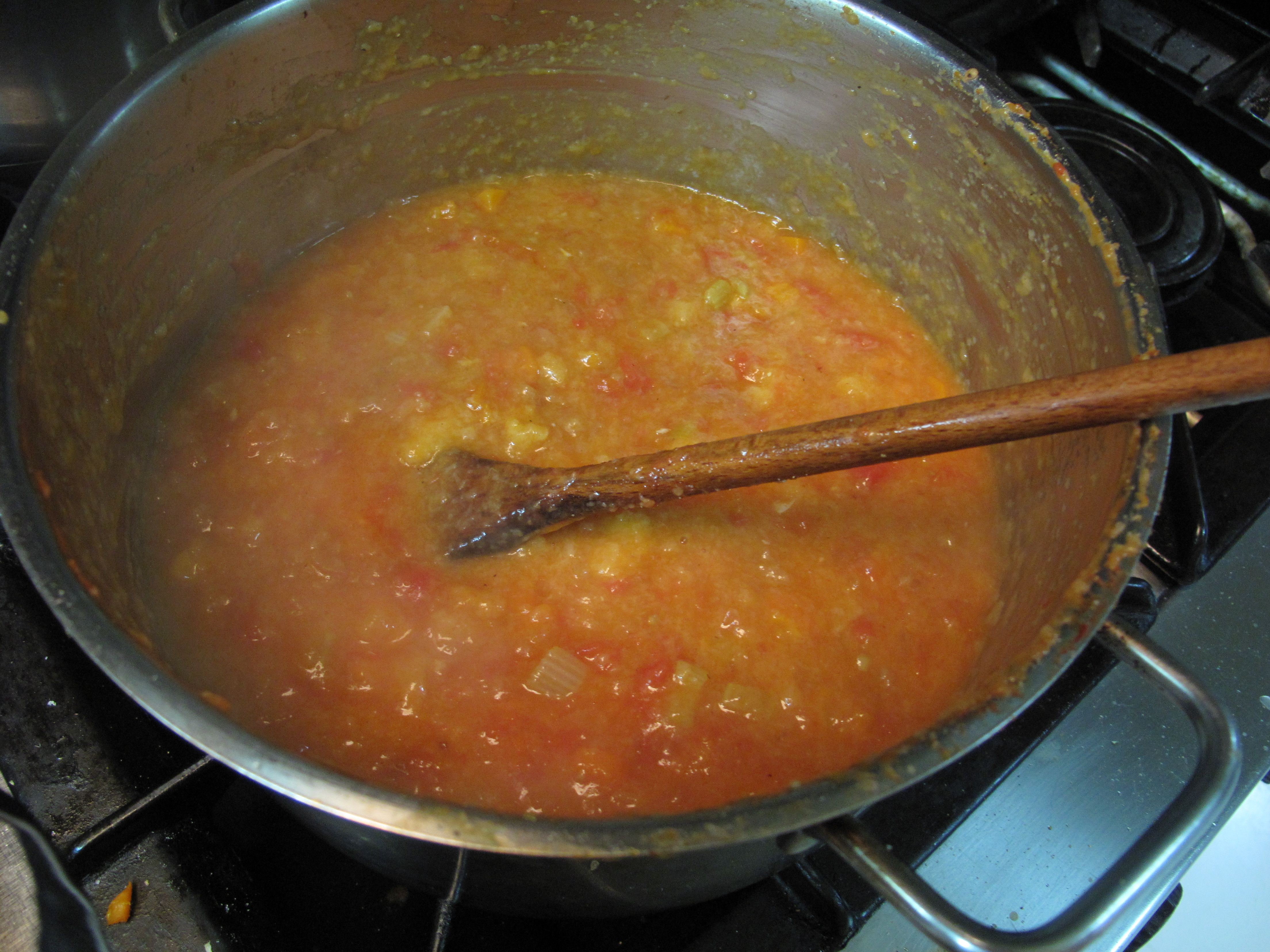 Add the chopped tomatoes and then cook for another 15-20 minutes, stirring occasionally, until the mixture thickens (see below). Season generously with salt and pepper