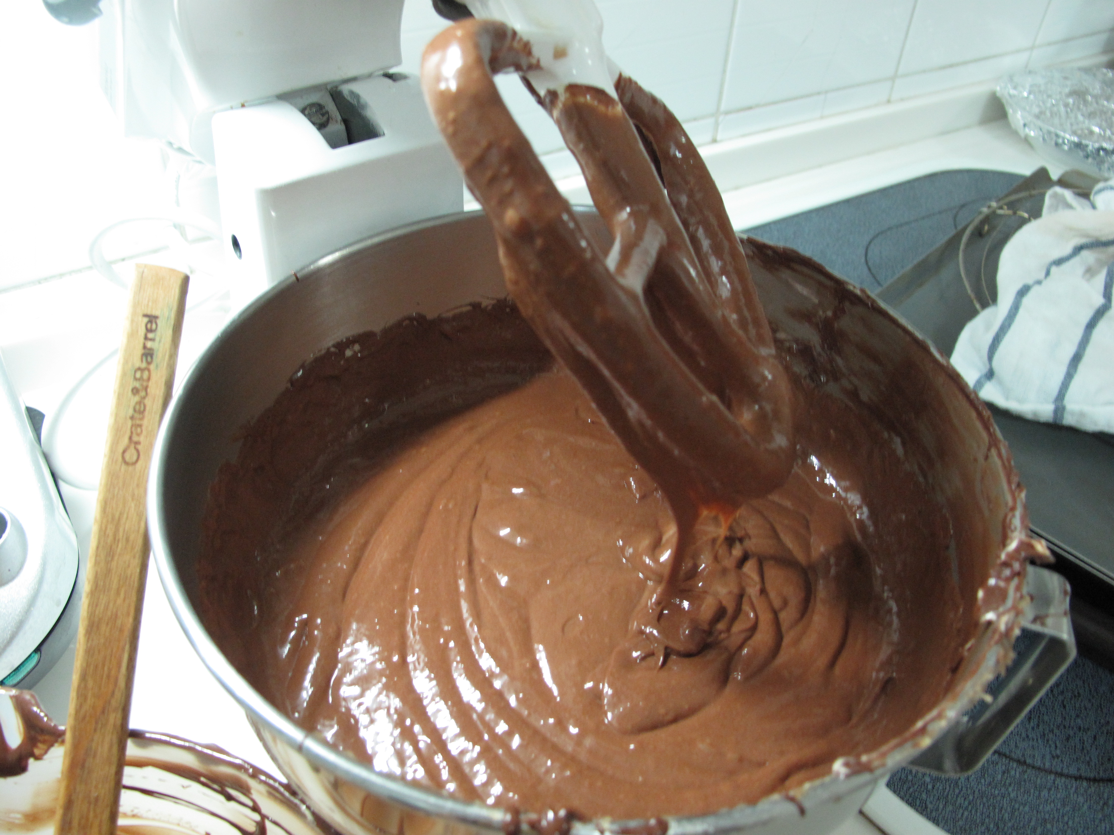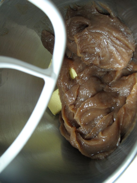 In a large bowl, using the paddle attachment, mix the chestnut puree with the butter. Then, mix in the vanilla, the egg yolks and the 280 grams melted chocolate until blended.