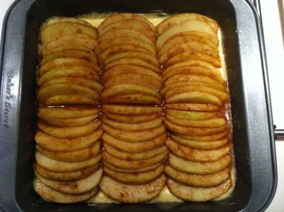 - Arrange the apple slices on top of the batter in overlapping rows, pressing lightly into the batter.