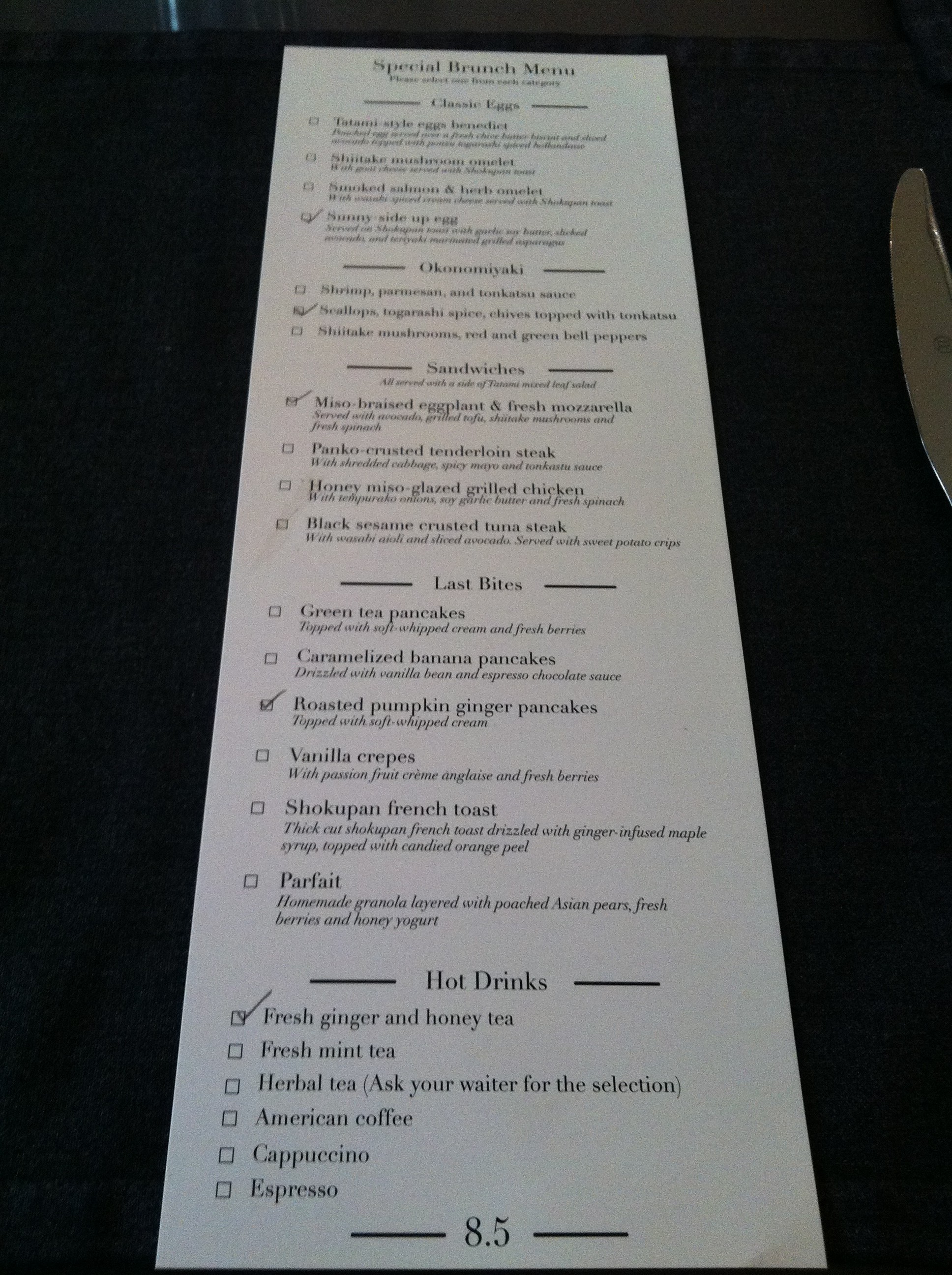 For the launch, a set menu was introduced so you get to try almost everything. A menu was placed in front of you that looked exactly like a breakfast menu from a hotel’s room service. From each section, you tick your choice of classic eggs, okonomiyaki, sandwiches, last bites and hot drinks.