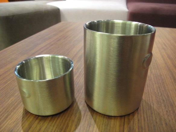 How old school do these look! Don’t they remind you of tin mugs that are usually attached to outdoor water coolers? These, however, are a notch or two more cooler. The way you hold these cups is by placing your thumb and index finger on the circles on each side.