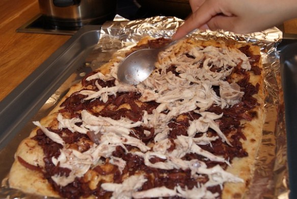 Spread equal portions of the onions on the breads. Then top the onions with equal portions of the pulled chicken.