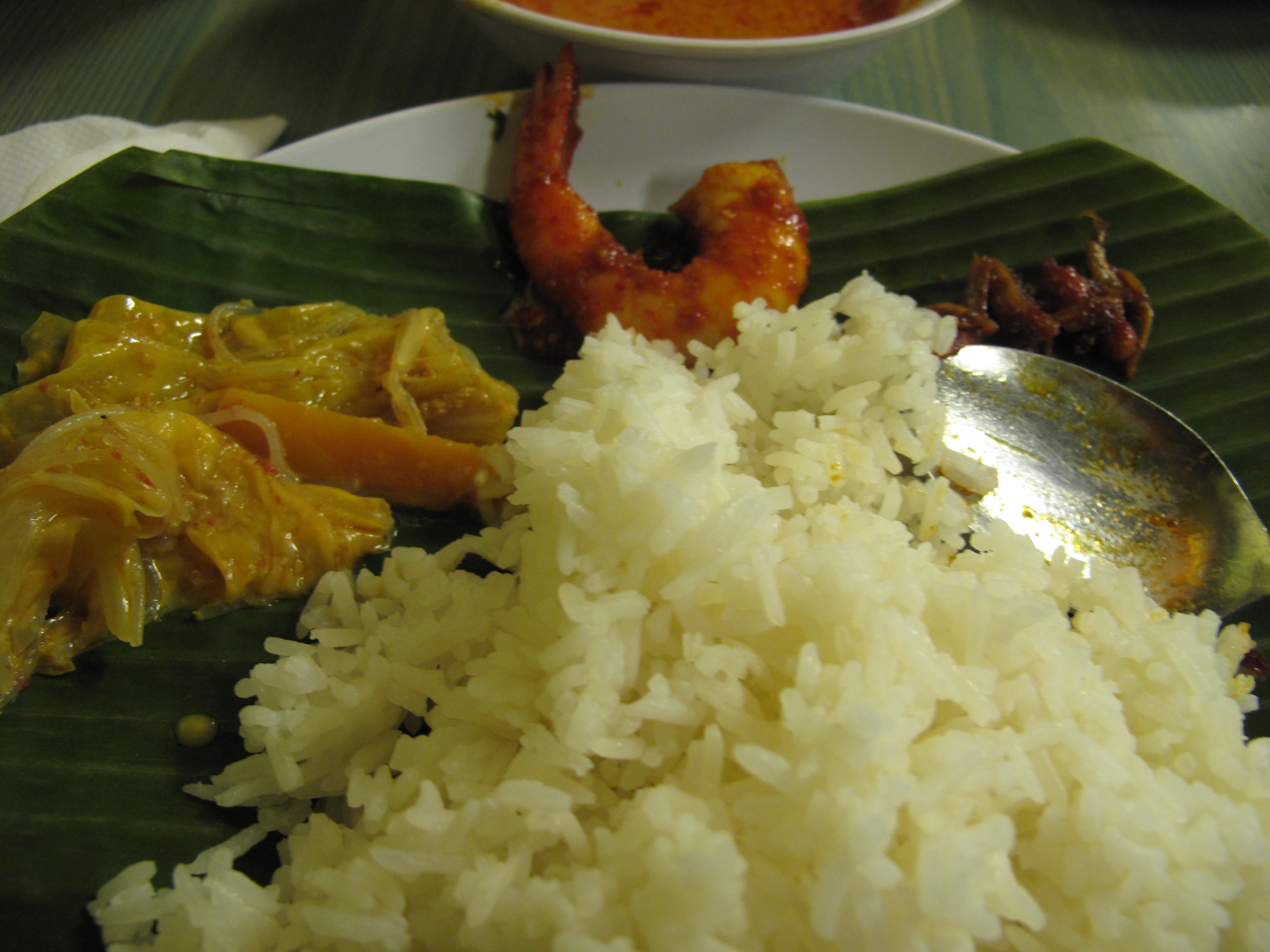 My plate! They give each customer a plate of rice laid on a banana leaf. Very cute!