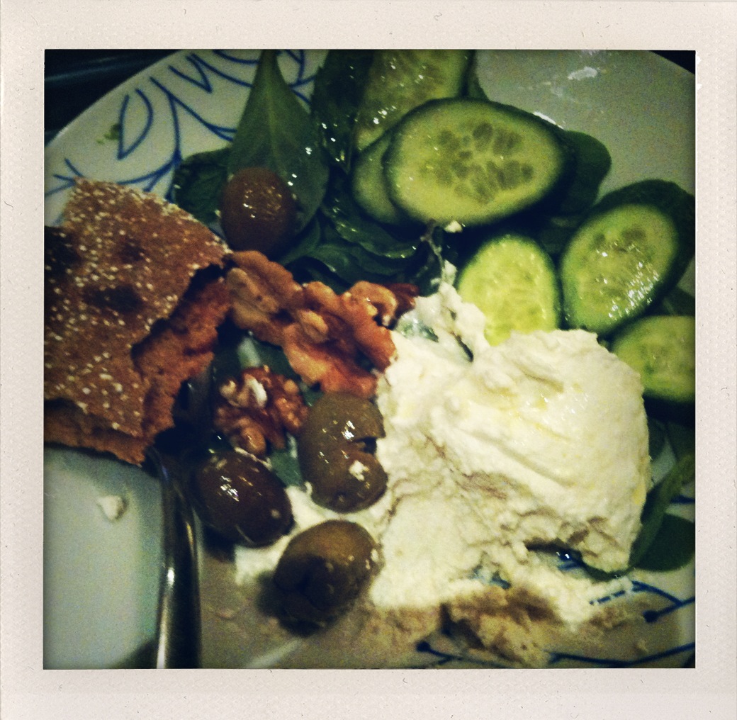 In a bowl, I spooned some of the ricotta cheese, added barbeer, mint, cucumber slices, walnuts, green olives, a drizzle of olive oil and a few flakes of sea salt.